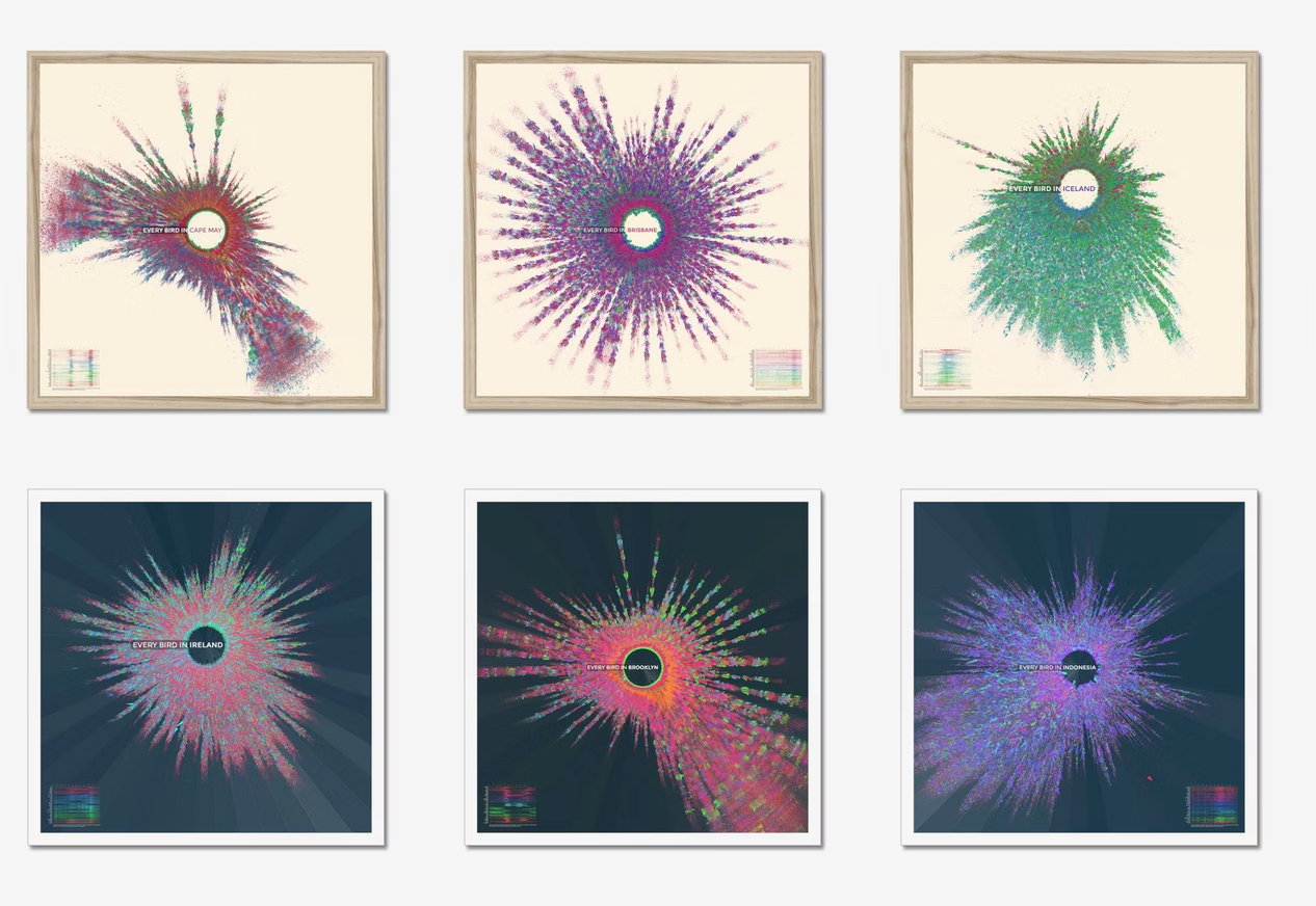 Every. Single. Bird. Jer Thorp, an incredible data artist, is similarly interested in feathered friends. He has a beautiful collection of data-driven bird art for sale on his site.