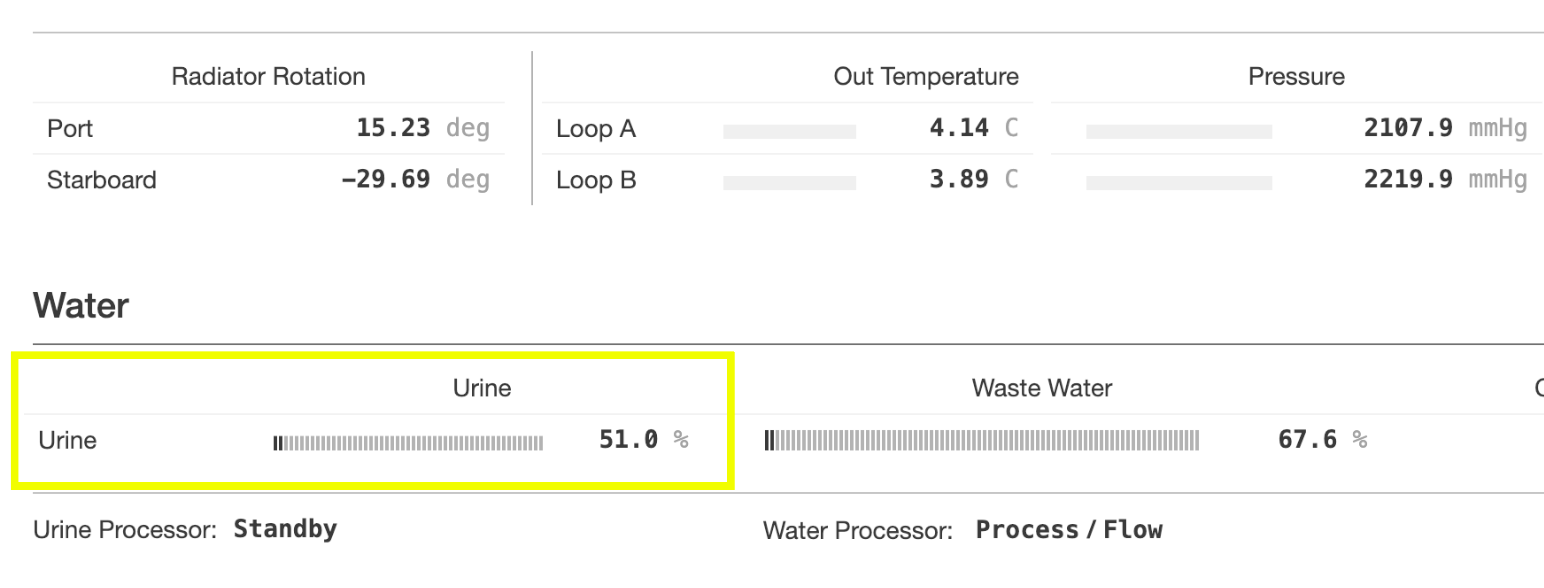 A wee bit of data. NASA reports real-time metrics on the International Space Station, which includes... onboard urine levels. You're thinking: this needs a bot. Already done.