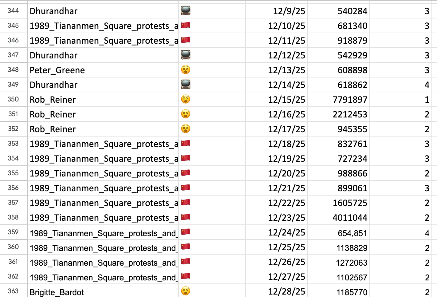 So, there was a lot of interest in the Tiananmen Square protests in December. In fact, this Wikipedia page was the most-read on 25 days. I failed to find any reason for this, however, and I'm pretty confident it's due to bot activity. Bots drive noticeable traffic to other Wikipedia sites β the page about the .xxx domain, for one β but since I can't be sure, I kept Tiananmen Square in the data.